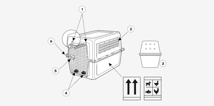 - Jeweils eine Wasser- und eine Futterschale müssen vorhanden sein und am Transportbehälter befestigt werden. Wasserbehälter dürfen für den Flug nicht befüllt werden, müssen aber von außen zugänglich sein. Futter und Wasser für den Flug können in dichten Behältern bereitgestellt werden.